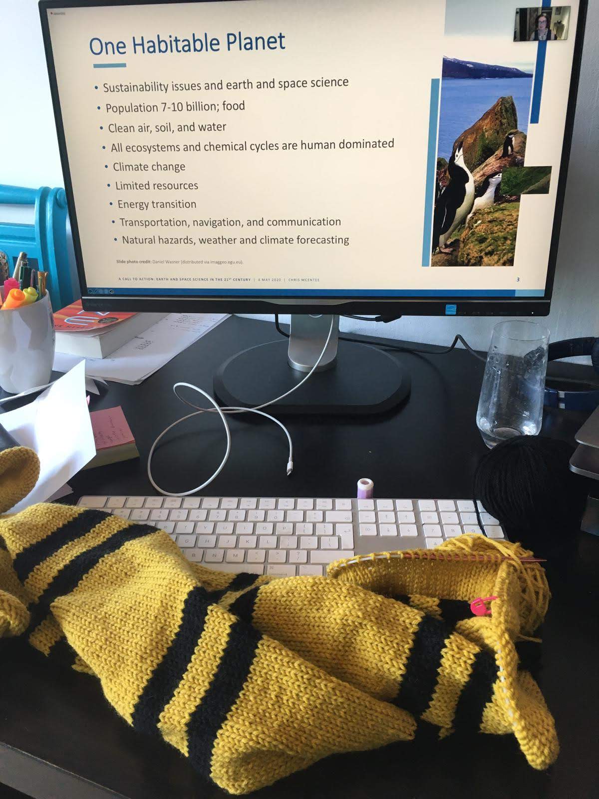 People have made nice workplaces in their homes, with lots of screens, nice garden views, and knitting projects